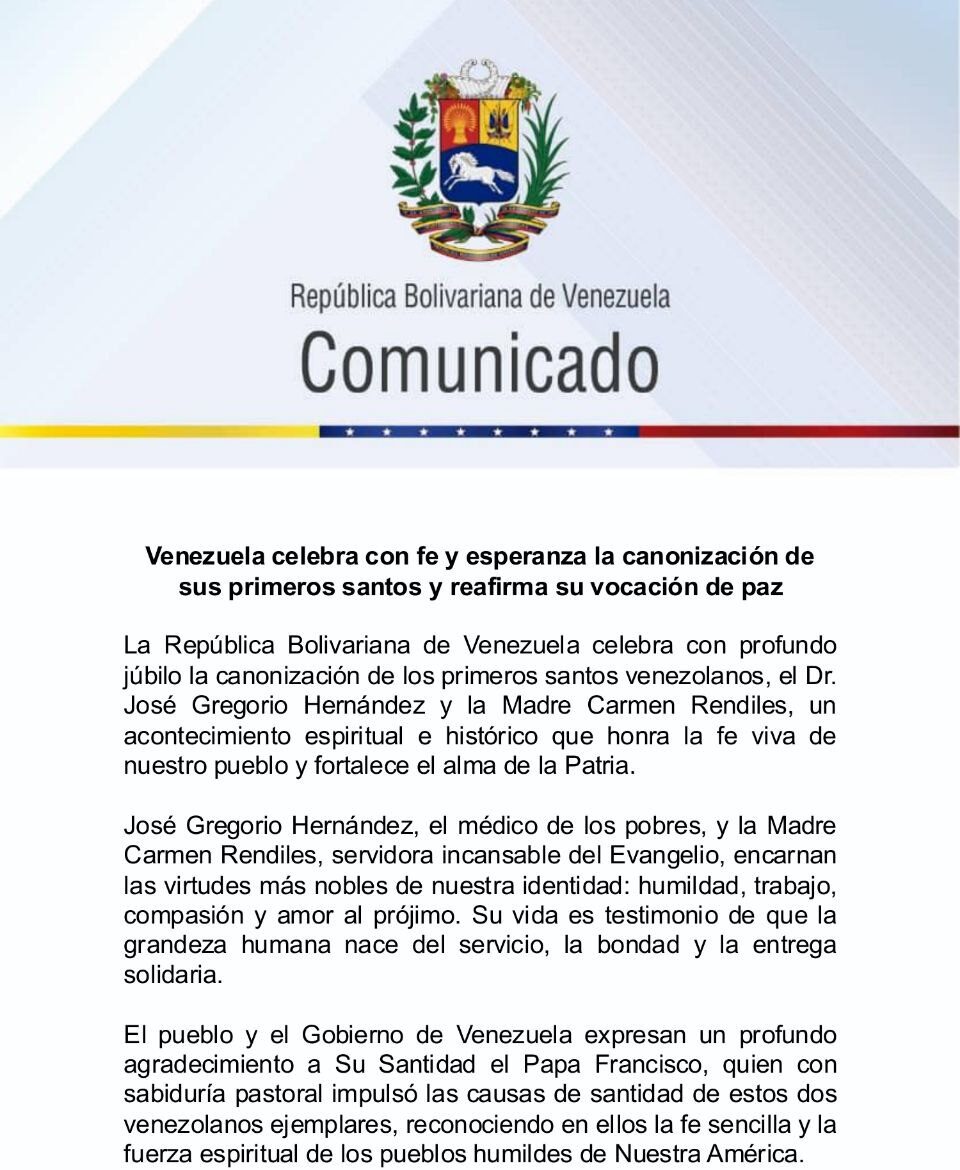 AAl mismo tiempo, expresamos nuestro reconocimiento a su santidad el papa León XIV, bajo cuyo pontificado se ha formalizado esta canonización, gesto que estrecha aún más los lazos fraternos entre Venezuela y la Iglesia católica universal. Valoramos su mensaje de reconciliación, humanidad y encuentro entre las naciones», expresó.