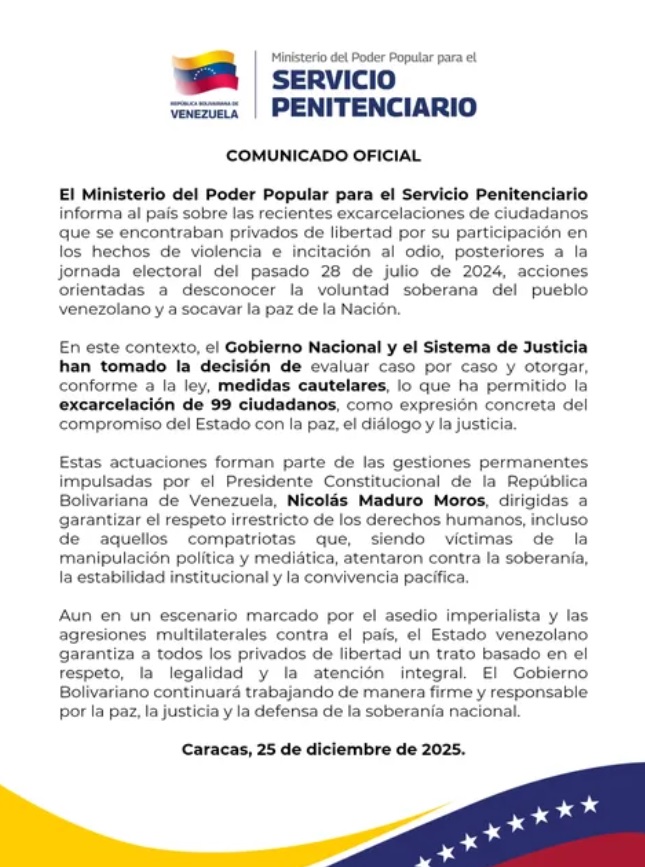 «Desde la madrugada de este jueves 25 de diciembre, madres, familiares y amigos han reportado la excarcelación de al menos 60 personas desde la cárcel de Tocorón, así como de 9 mujeres presas políticas detenidas en Las Crisálidas, y 3 adolescentes provenientes de La Guaira», publicaron en su cuenta oficial en la red social X.