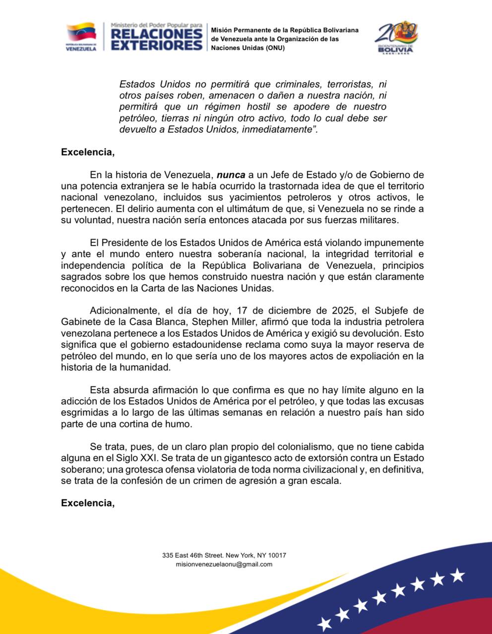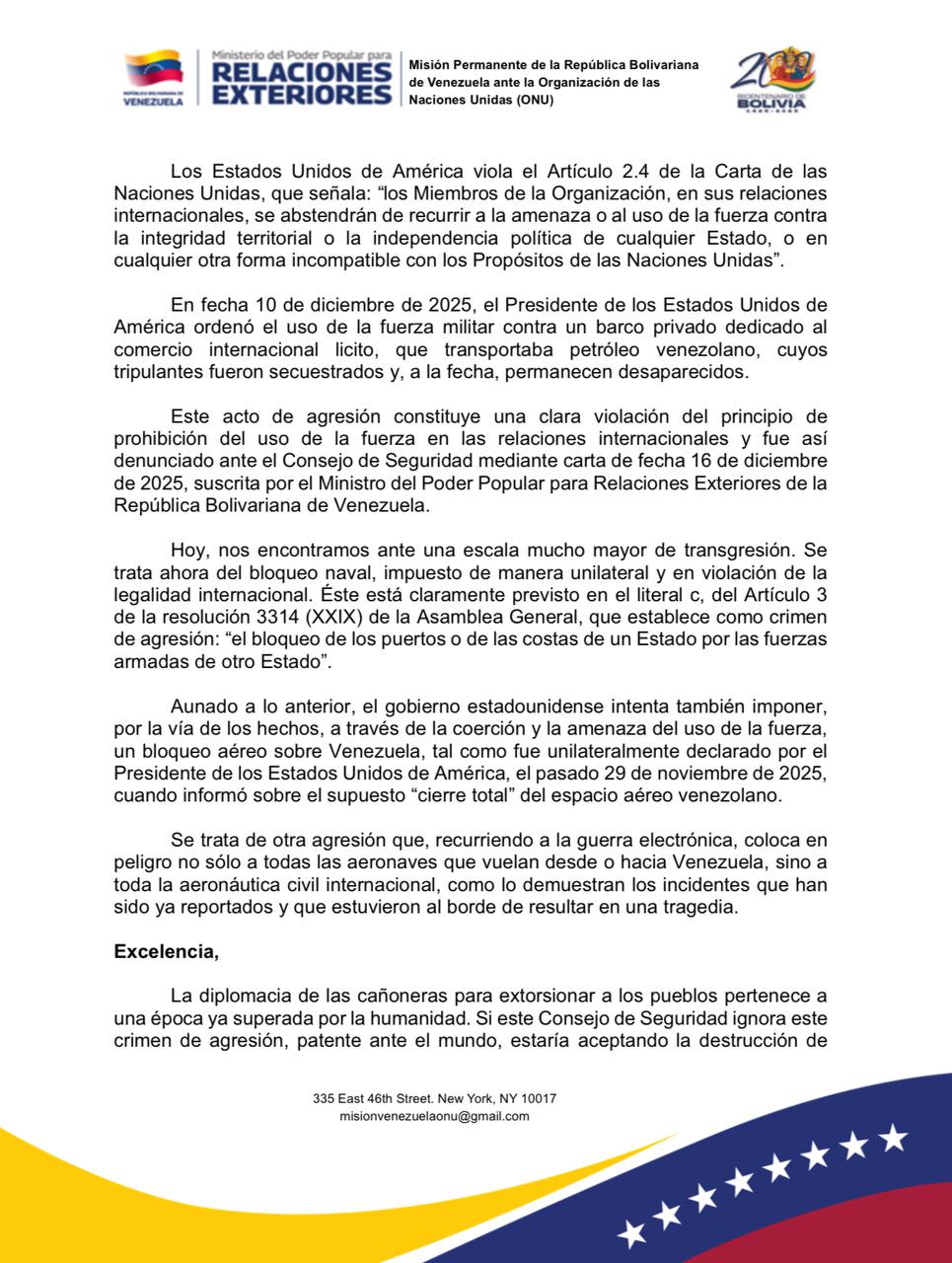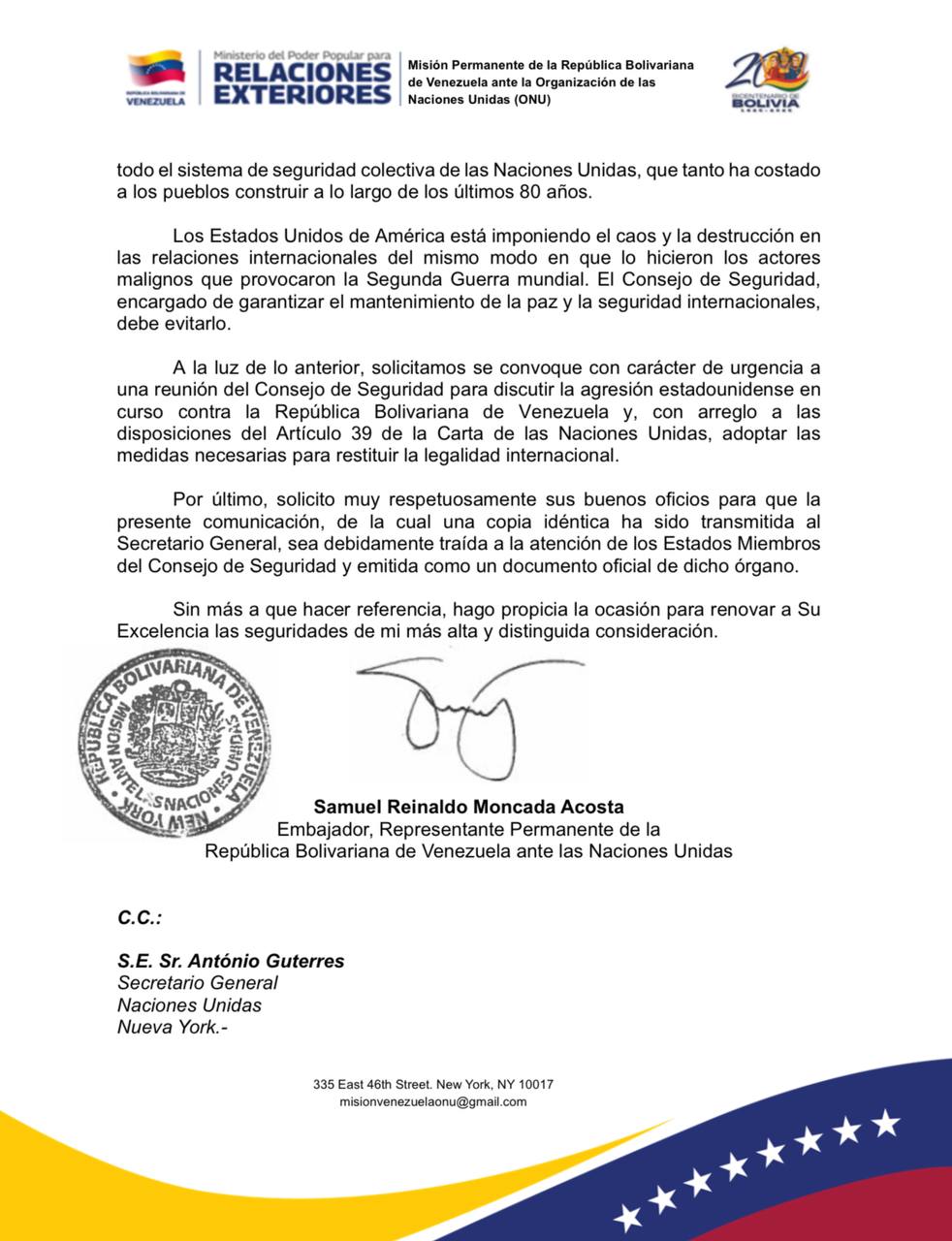 «Solicitamos se convoque con carácter de urgencia a una reunión del Consejo de Seguridad para discutir la agresión estadounidense en curso contra la República Bolivariana de Venezuela y, (…) adoptar las medidas necesarias para restituir la legalidad internacional», indicó el canciller del régimen, Yván Gil, en un comunicado publicado en su canal de Telegram.