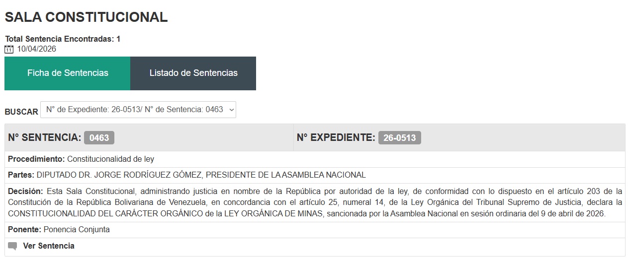 El Tribunal Supremo de Justicia (TSJ) declaró la constitucionalidad del carácter orgánico de la Ley de Minas, sancionada por la Asamblea Nacional chavista el pasado jueves 9 de abril.