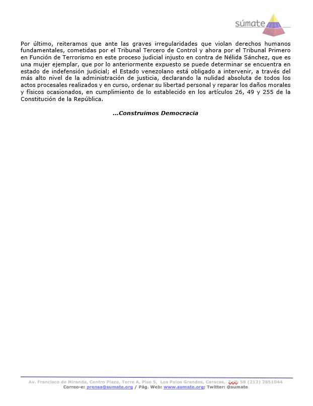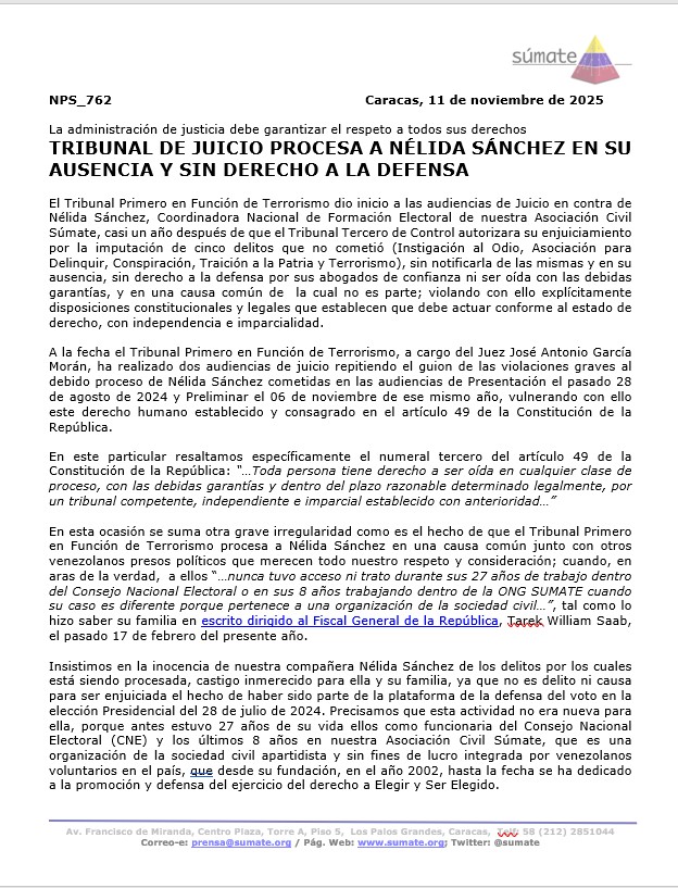 «Nuestra Asociación Civil Súmate se pronuncia ante las graves irregularidades cometidas en el inicio de las audiencias de juicio por parte del Tribunal Primero en Función de Terrorismo en contra de Nélida Sánchez, nuestra Coordinadora Nacional de Formación Electoral, al llevarlas a cabo sin notificarla de las mismas y en su ausencia, sin derecho a la defensa por sus abogados de confianza ni ser oída con las debidas garantías, y en una causa común de la cual no es parte; violando con ello explícitamente disposiciones constitucionales y legales que establecen que debe actuar conforme al estado de derecho, con independencia e imparcialidad», destaca la organización en sus redes sociales.