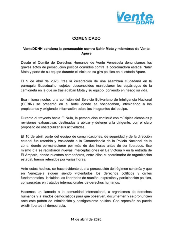 El Comité de Derechos Humanos de Vente Venezuela denunció este martes una serie de actos de persecución política contra la coordinadora estadal del partido en Apure, Nahir Mota, y parte de su equipo durante el inicio de una gira política en el estado llanero los días 9 y 10 de abril.